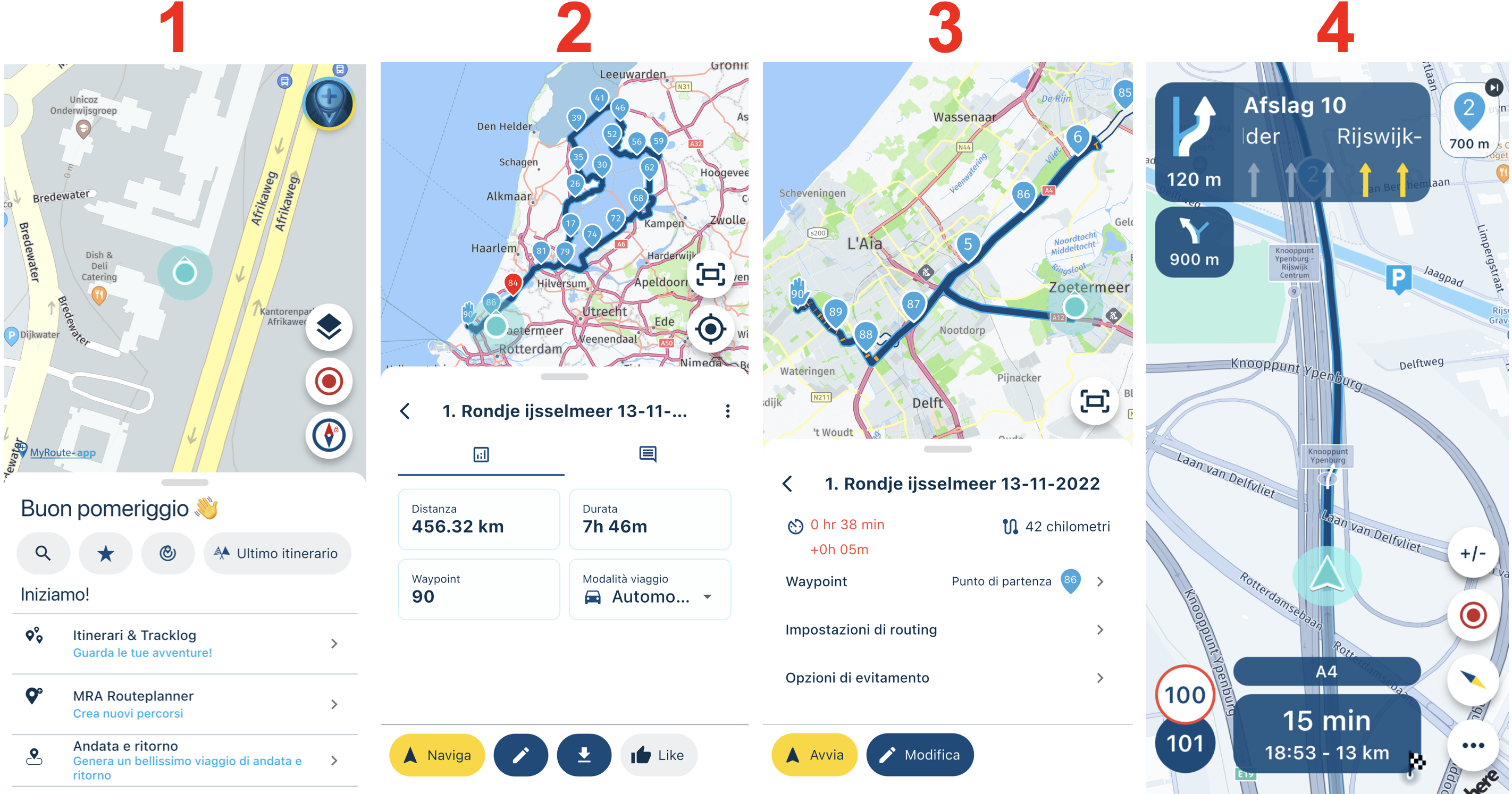 Qui puoi vedere quali schermate ti verranno presentate quando avvierai un percorso per la navigazione nell'app. Di tanto in tanto il manuale farà riferimento a queste schermate.
