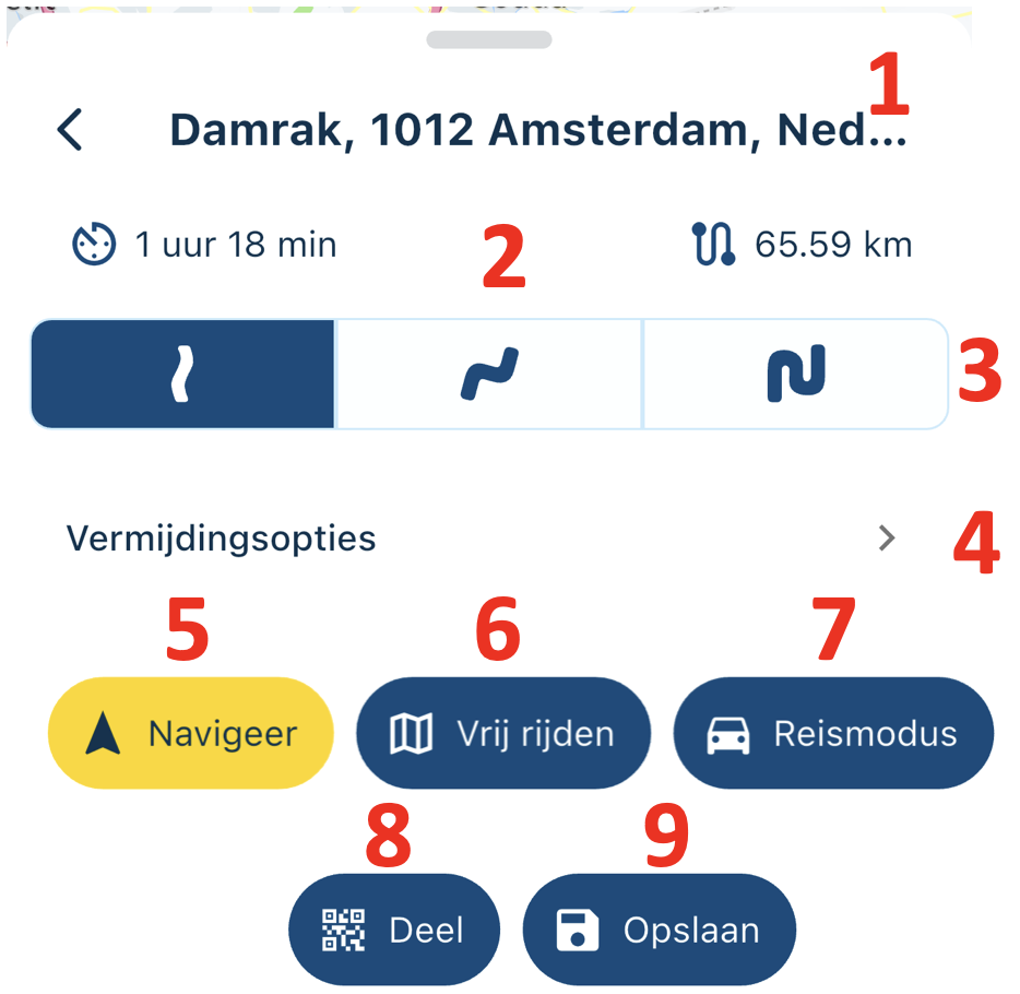 - Reismodus: Voordat de route wordt gegenereerd of gestart, is het mogelijk om de reismodus aan te passen;
